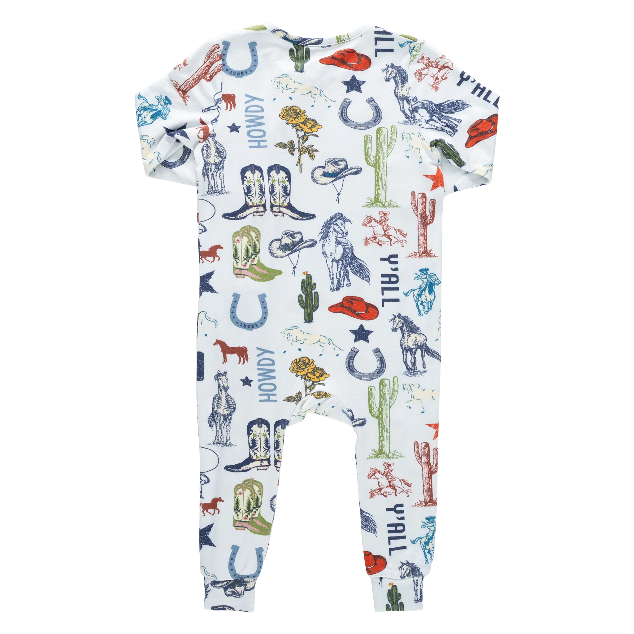 Saddle up for soft snuggles! Our Baby Bamboo Romper features our playful Western Dreams print, filled with charming cowboy-inspired icons for a little western whimsy. Designed with everyday ease in mind, sizes 0/3m and 3/6m include fold-over hand and foot cuffs for extra coziness, while a two-way zipper with a protective cover makes diaper changes quick and stress-free. Made from ultra-soft bamboo fabric with a smooth, silk-like feel, this breathable romper keeps littles cool in warm weather and comfy all year long.