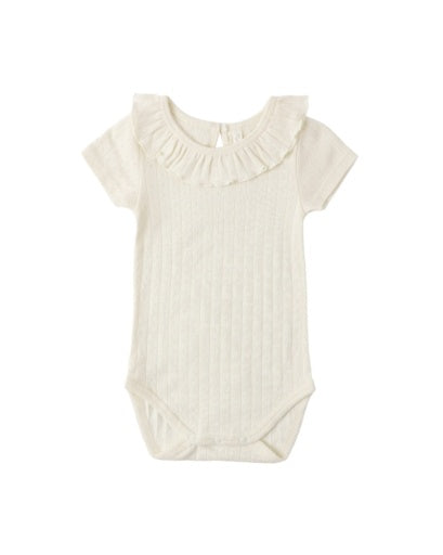 Short sleeve onesie, with a cute ruffled collar. All sizes have snaps at the inseam for easy changing.