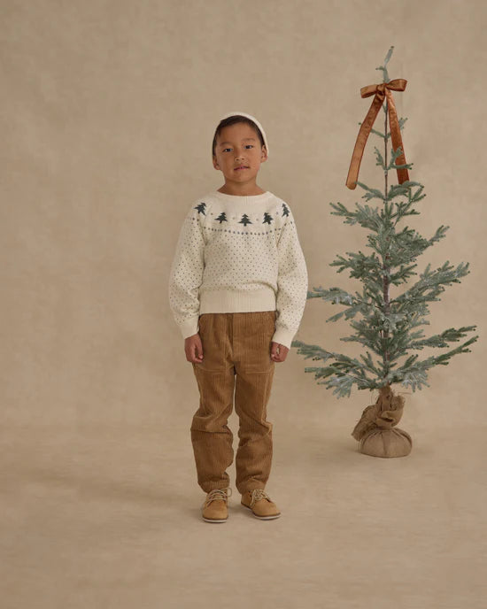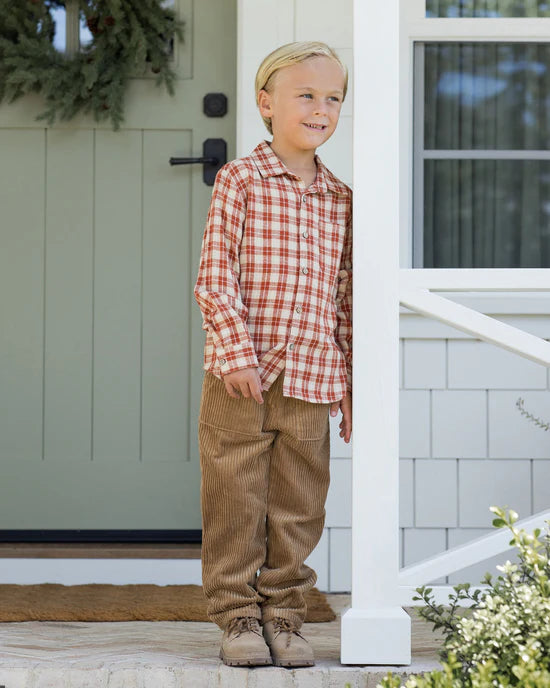 The Oliver Pant, crafted from soft stretch corduroy, features an elastic waistband with an adjustable drawstring and functional utility pockets for everyday use.Featuring our 'toffee' corduroy.